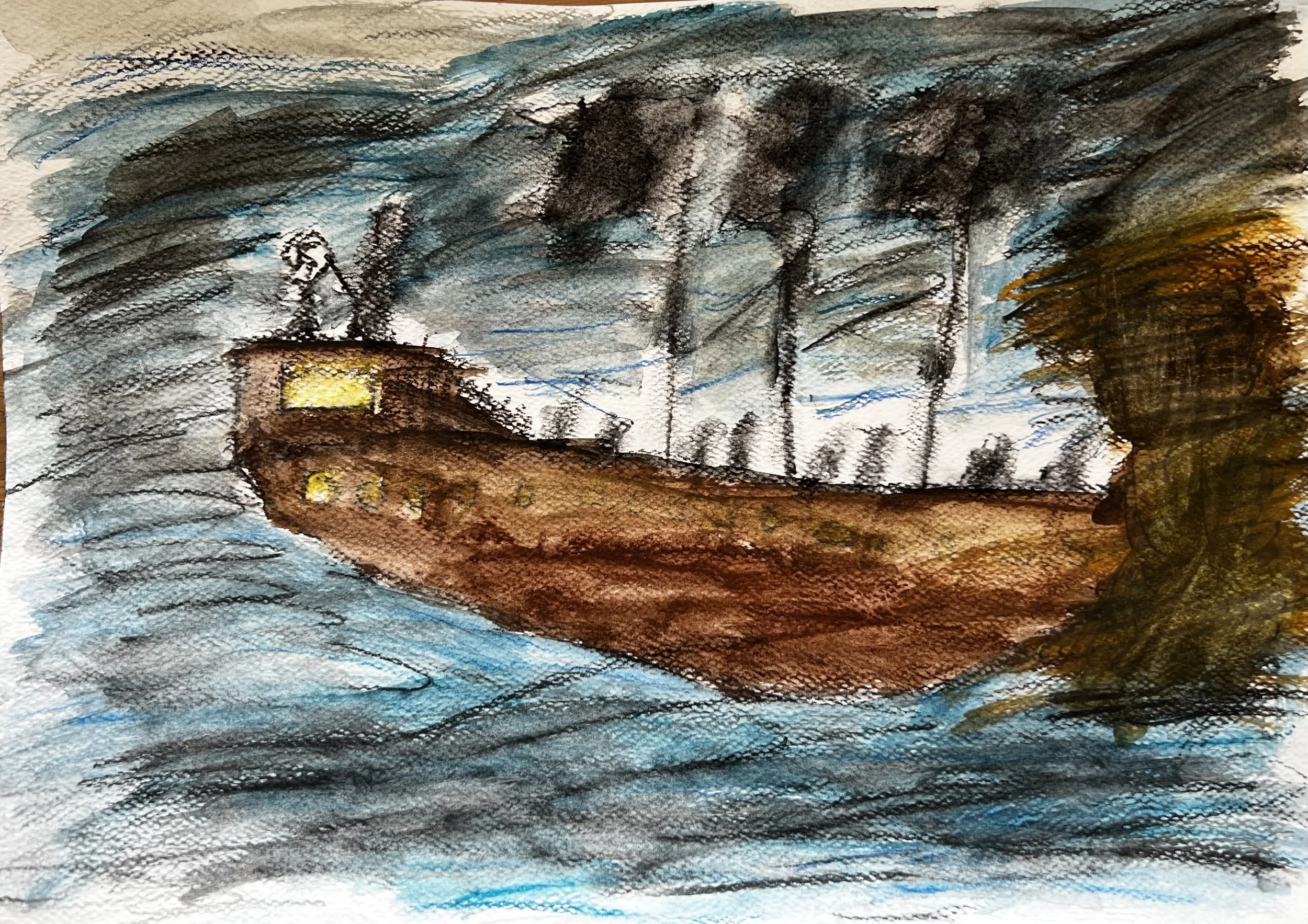This is on textured watercolour paper, using watercolour pencils and water, and some charcoal sticks.